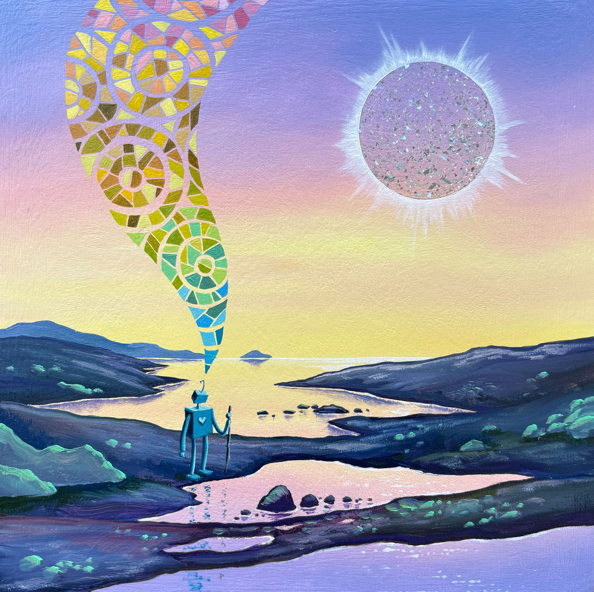 This painting features holographic eclipse in the sky that shimmers rainbow from different angles, and a contemplative robot with rippling thought waves.