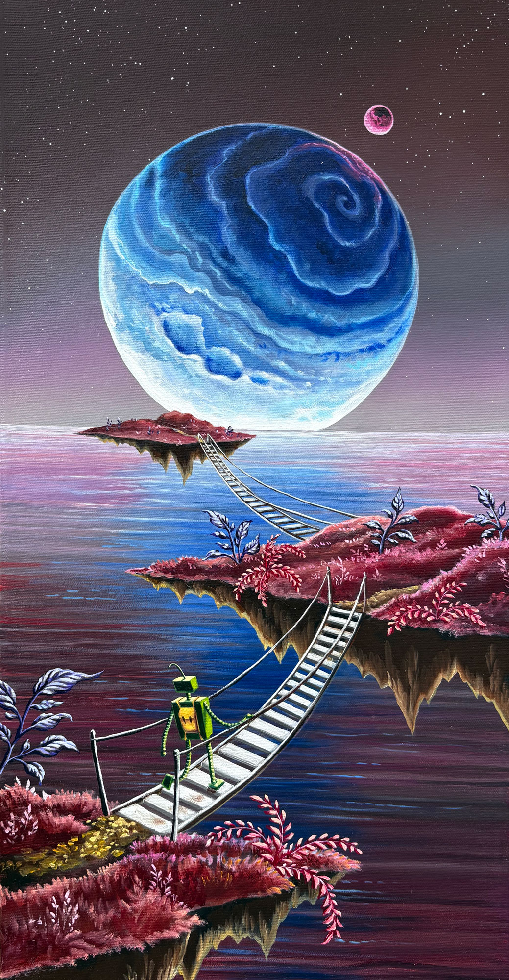 This canvas features a robot character heading out over a suspended bridge connecting a series of floating islands.