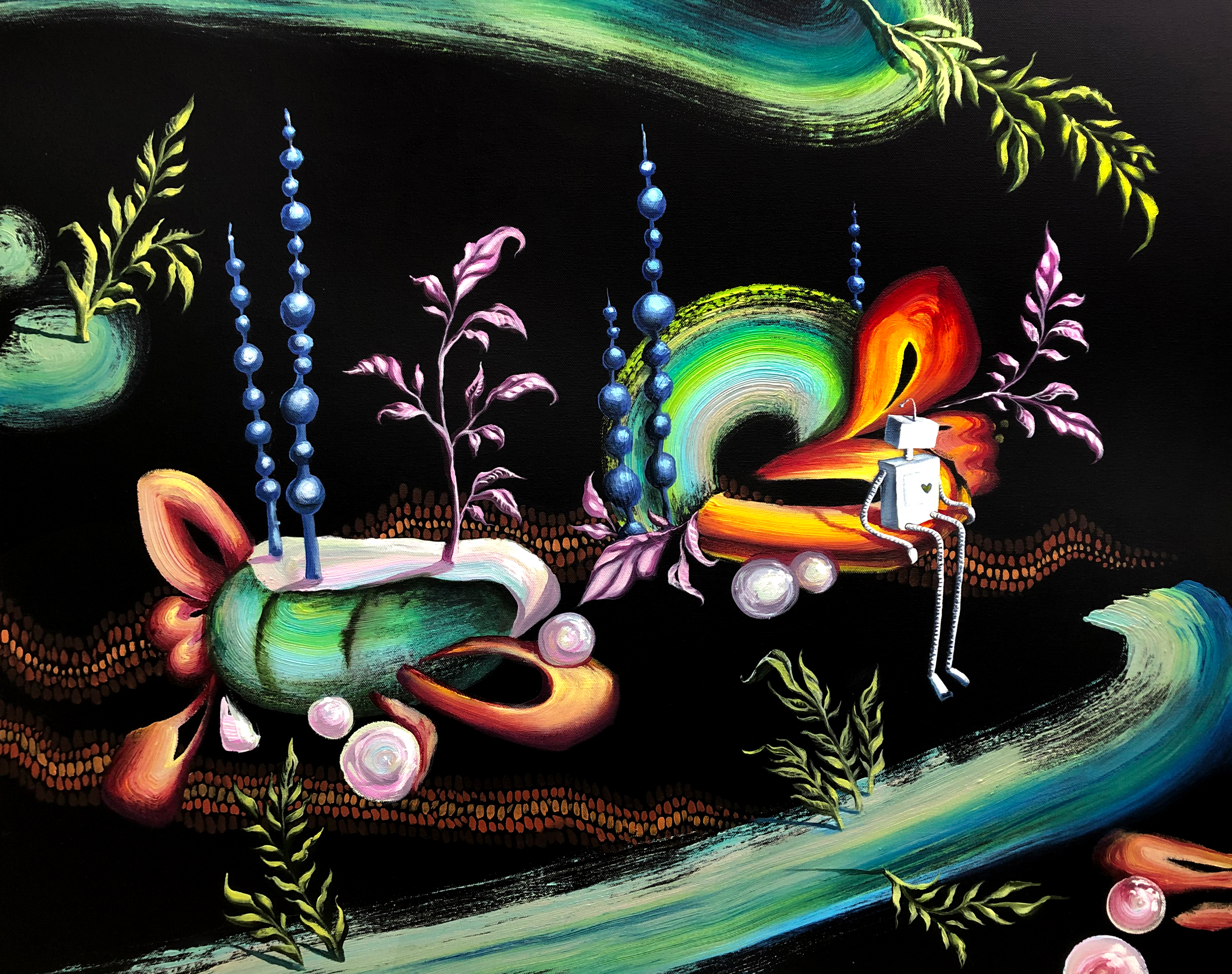 This painting features a white robot existing amongst abstracted brush-mark floating islands. As part of my series of Dreamscapes paintings, this piece explores the idea of perceived realities and identity. Edges are painted a dark neutral Paynes Grey colour – comes wired and ready to hang.