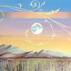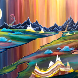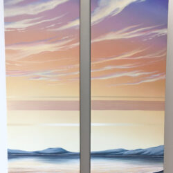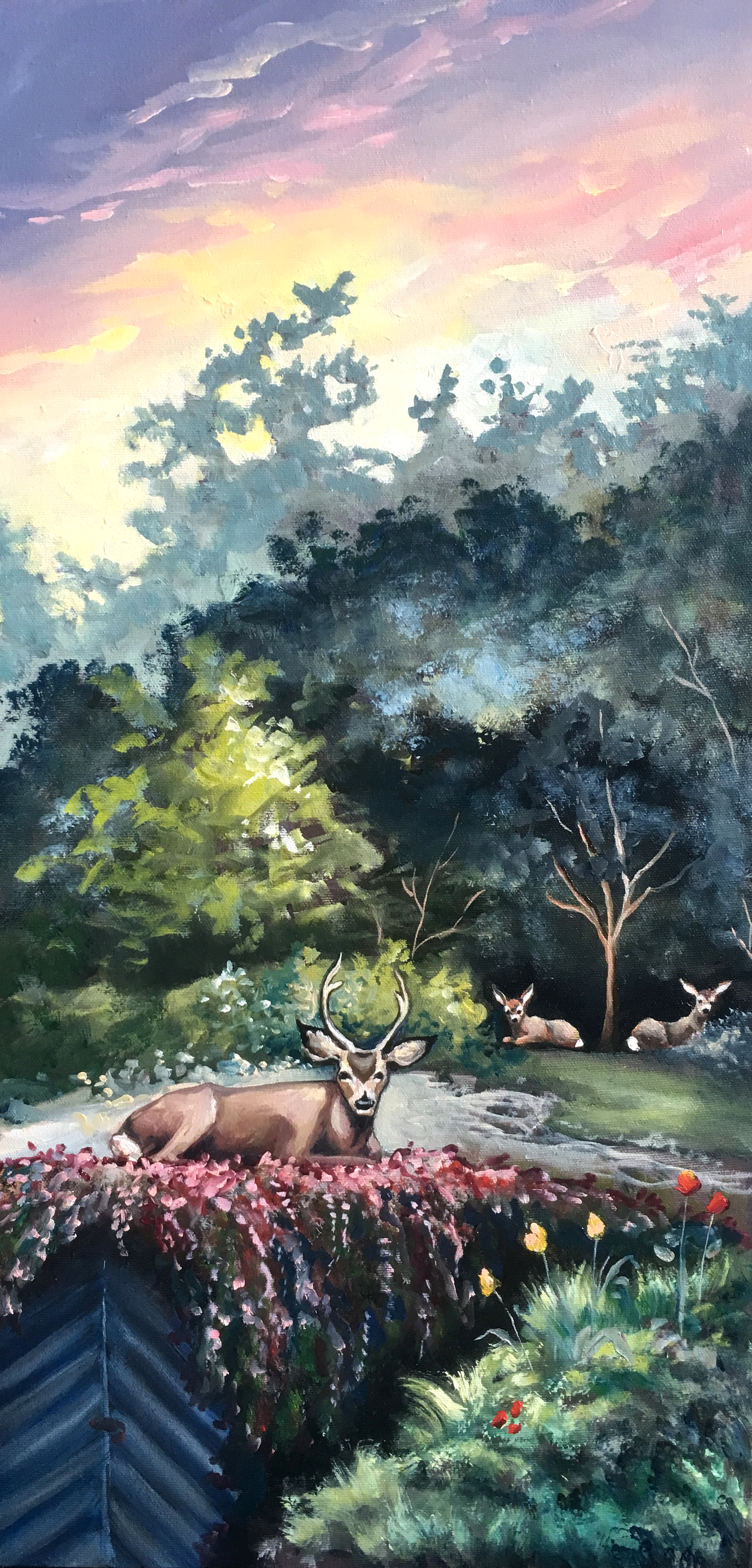 This painting was created during my artist residency at the Mackie Lake House in September of 2018. This piece features the family of deer that lived on the property while I was there. In the mornings I would often find the Stag perched atop the root cellar, with his family resting in the bushes behind him.