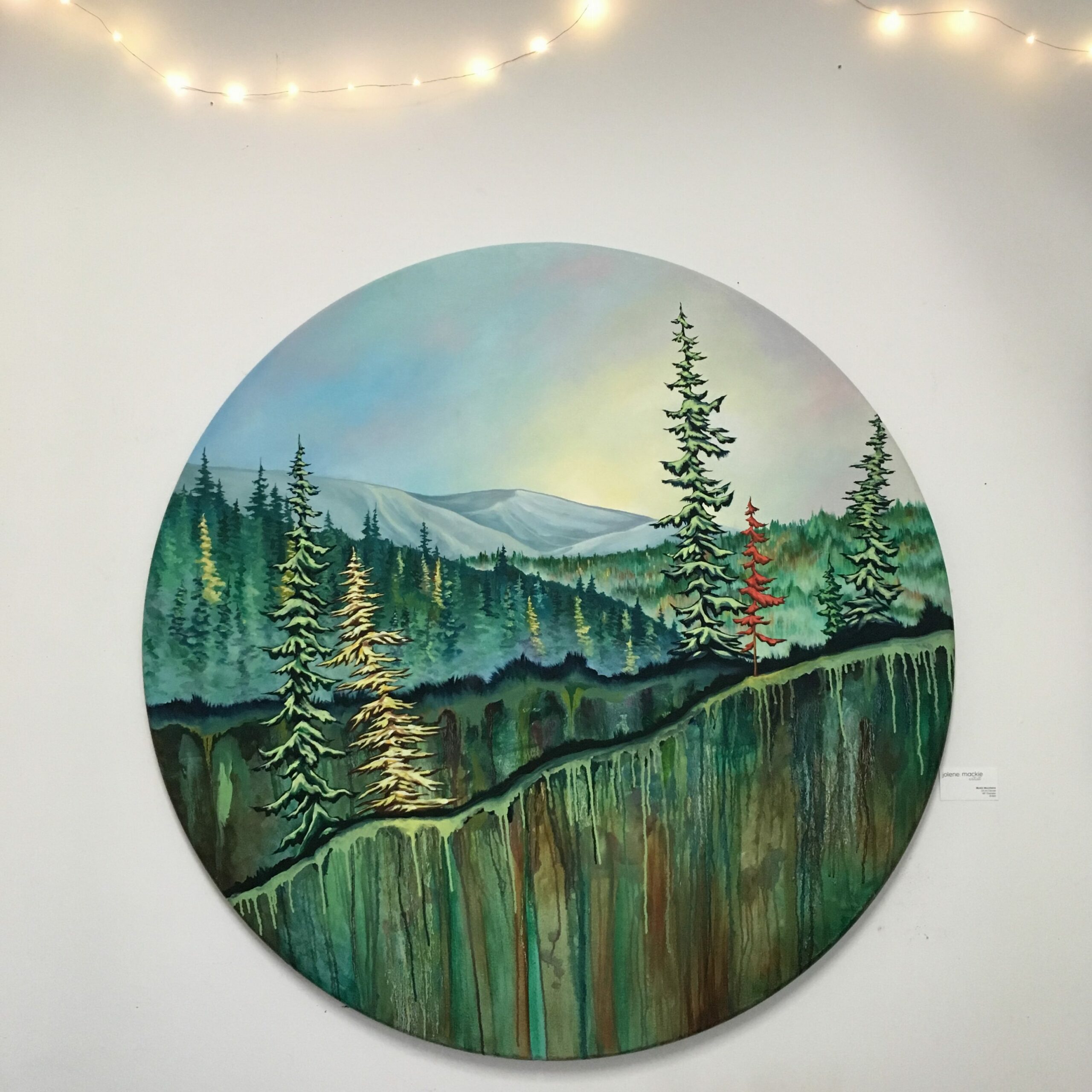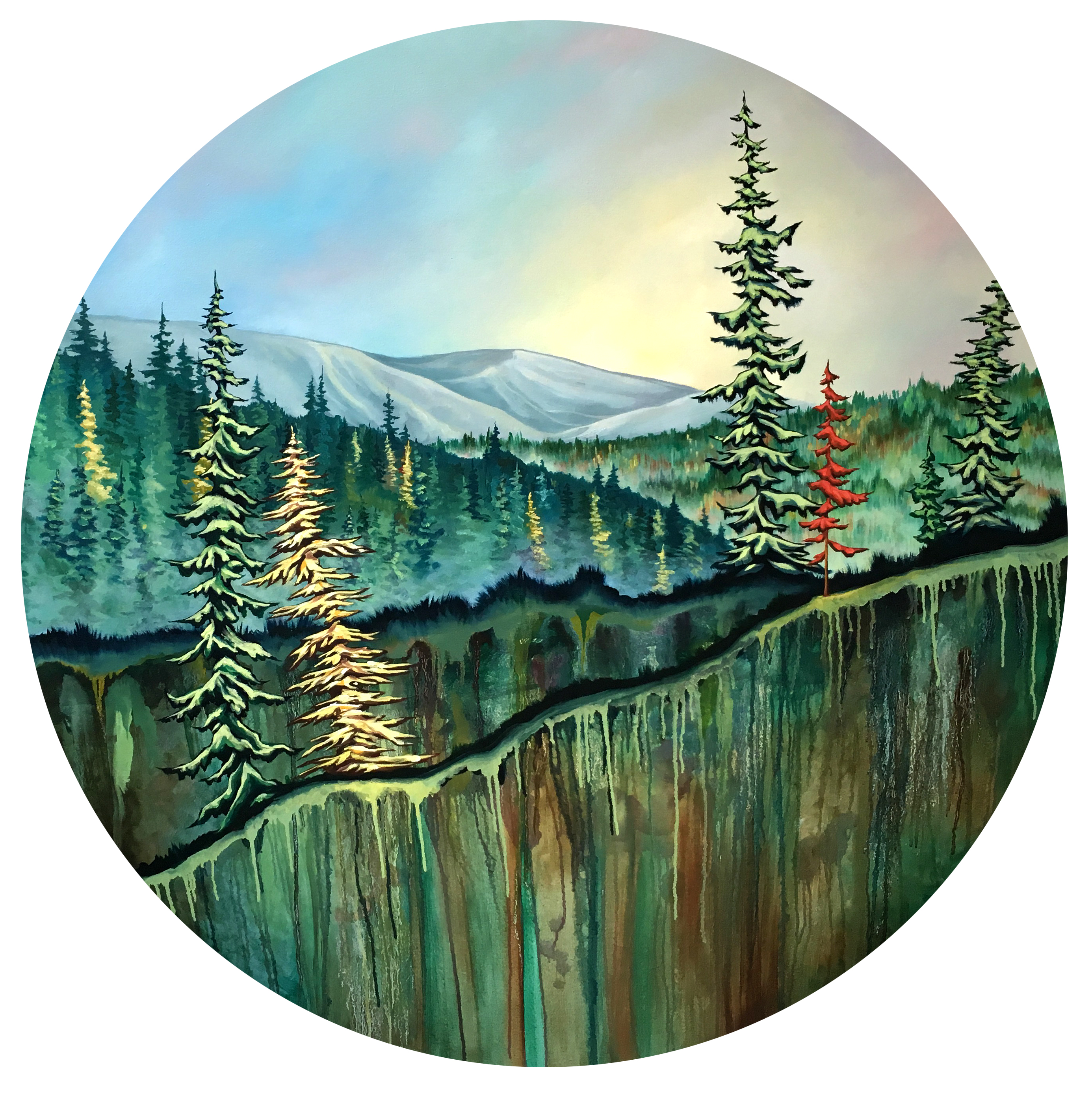 This painting features rolling forested mountains that diminish into the background. In the foreground I have allowed paint to drip and flow to the bottom edge of the canvas, in contrast to the carefully rendered landscape. I feel this element speaks to the mysteries that lie below the surface.