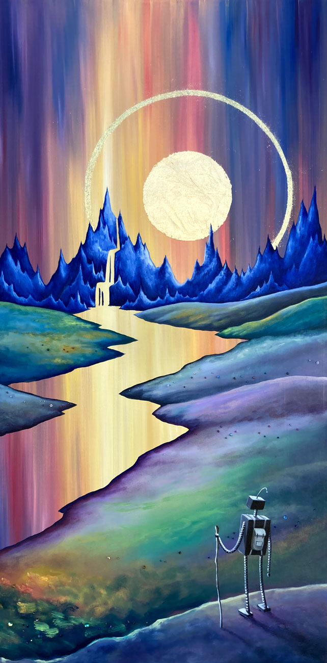 This canvas features a robot gazing at a gold leafed sunset, and a scattering of beaded embellishments that have been stitched directly onto the canvas.