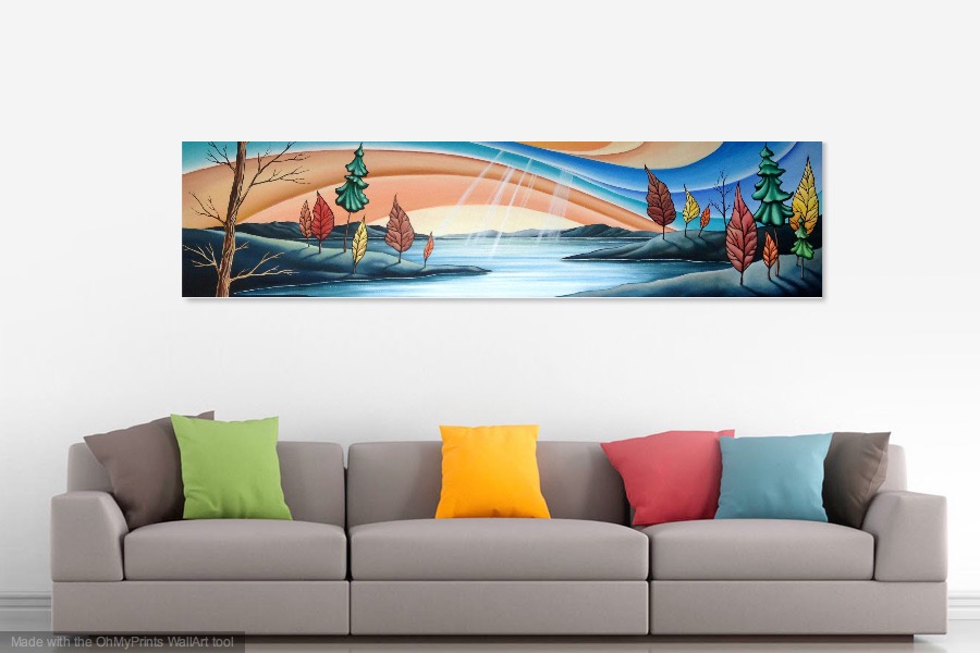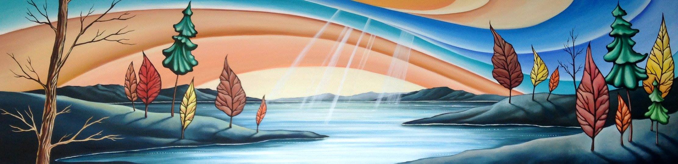 This painting features a stylize swooping sky, with just a few bright crepuscular rays breaking through to hit the waters surface. This playful and colourful piece was inspired by those moments in nature that make me stop and reconsider how precious this time is that we have, and remind me to truly enjoy and appreciate it.
