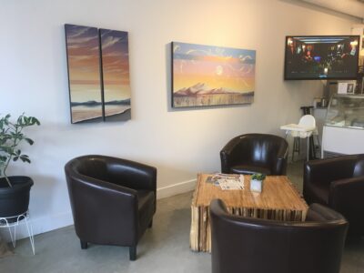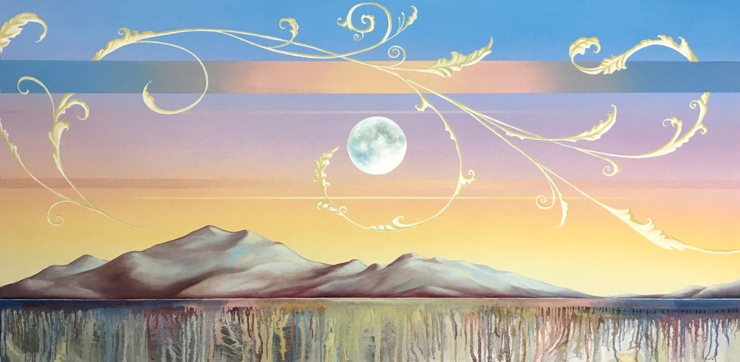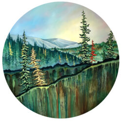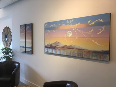 This painting features a band of silver leaf that runs across the bottom of the painting. This feature picks up and reflects light beautifully. Edges are painted a dark neutral burnt umber colour – comes wired and ready to hang.